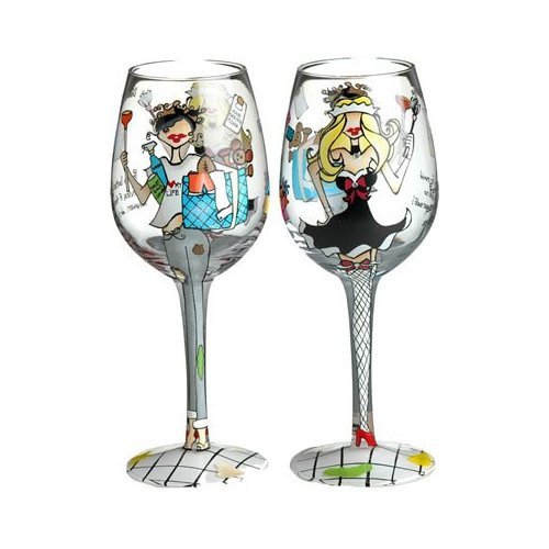 Bottom's Up "Domestic Diva" Hand Painted 15oz Wine Glass. The glass is a very popular new shape that is appropriate for either red or white wine. Its oversized 15 ounce capacity allows plenty of space for the wine to breath, allowing its full richness to unfold. A memorable gift that will actually get used over and over. Pictures show same glass front and back read more..