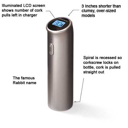 Other electric corkscrews don't have an LCD screen. Or a recessed spiral with a mechanism that locks on the bottle. Or a compact design that's up to 3 inches shorter. Or a sensational 'tube' package. Or the famous Rabbit brand. To make an electric corkscrew worthy of the Rabbit name, we had to reinvent it. read more..