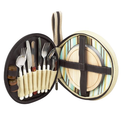 Deluxe travel picnic set for two. Unique round shape with 20 oz canvas fabric. Includes plates, flatware, corkscrew, cutting board, cheese knife, salt and pepper shakers. Loop style hand grip. Designed and assembled in the USA. Lifetime warranty read more..