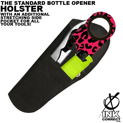 This is the way to always have your trusty bottle opener and other bar tools ready when you need them. Made out of durable vinyl with a leatherette feel, this Bottle Opener Holster not only looks sexy, but it can hold almost any of our openers including The Standard Inked Opener the V-ROD TM Bottle Opener, the Knuckle Duster Opener even our cool Butterfly Knife Action Bottle Openers and has an additional stretchy front pocket for anything else you may need at your side: lighter, pens, wine key...