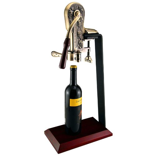 The Allavino UM702 Wine Uncorking Machine allows you to easily uncork your bottle and spend more time enjoying your wine! It is made of zinc alloy and steel with a rich antique bronze finish. Its ornate design of grapevines and clusters of grapes will please any wine lover and enhance any room. This set includes the opener and an attractive, stable wooden base with a sturdy metal bar support bracket. These sets have a hardwood cherry finish handle and base. read more..